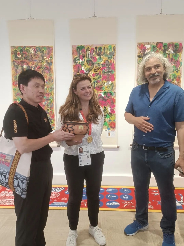 7月25日,在法國(guó)巴黎,來(lái)自三門(mén)峽市的王新軍(左)與現(xiàn)代奧林匹克運(yùn)動(dòng)會(huì)之父顧拜旦的曾孫女黛安·德·納瓦塞爾·德·顧拜旦夫人(中)進(jìn)行文化交流。王新軍作為仰韶彩陶制作技藝的領(lǐng)軍人物,他精心制作了“花開(kāi)奧運(yùn)”經(jīng)典彩陶盆與廟底溝花瓣紋彩陶盆,參加此次巴黎奧運(yùn)文化體育交流活動(dòng)。