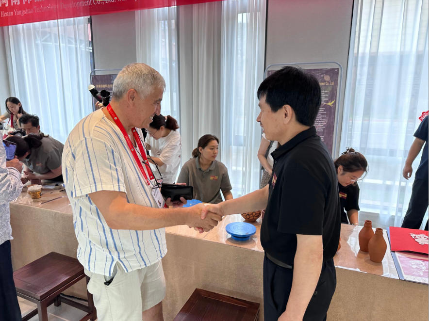 土耳其安卡拉全球咨詢集團(tuán)主席侯賽因.巴哲到河南仰韶科技公司現(xiàn)場體驗區(qū)體驗彩陶彩繪技藝,對仰韶文化的魅力贊不絕口。